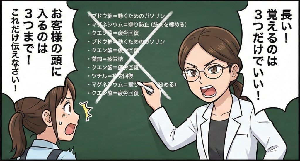 難しい成分説明は不要。3点に絞って伝える。